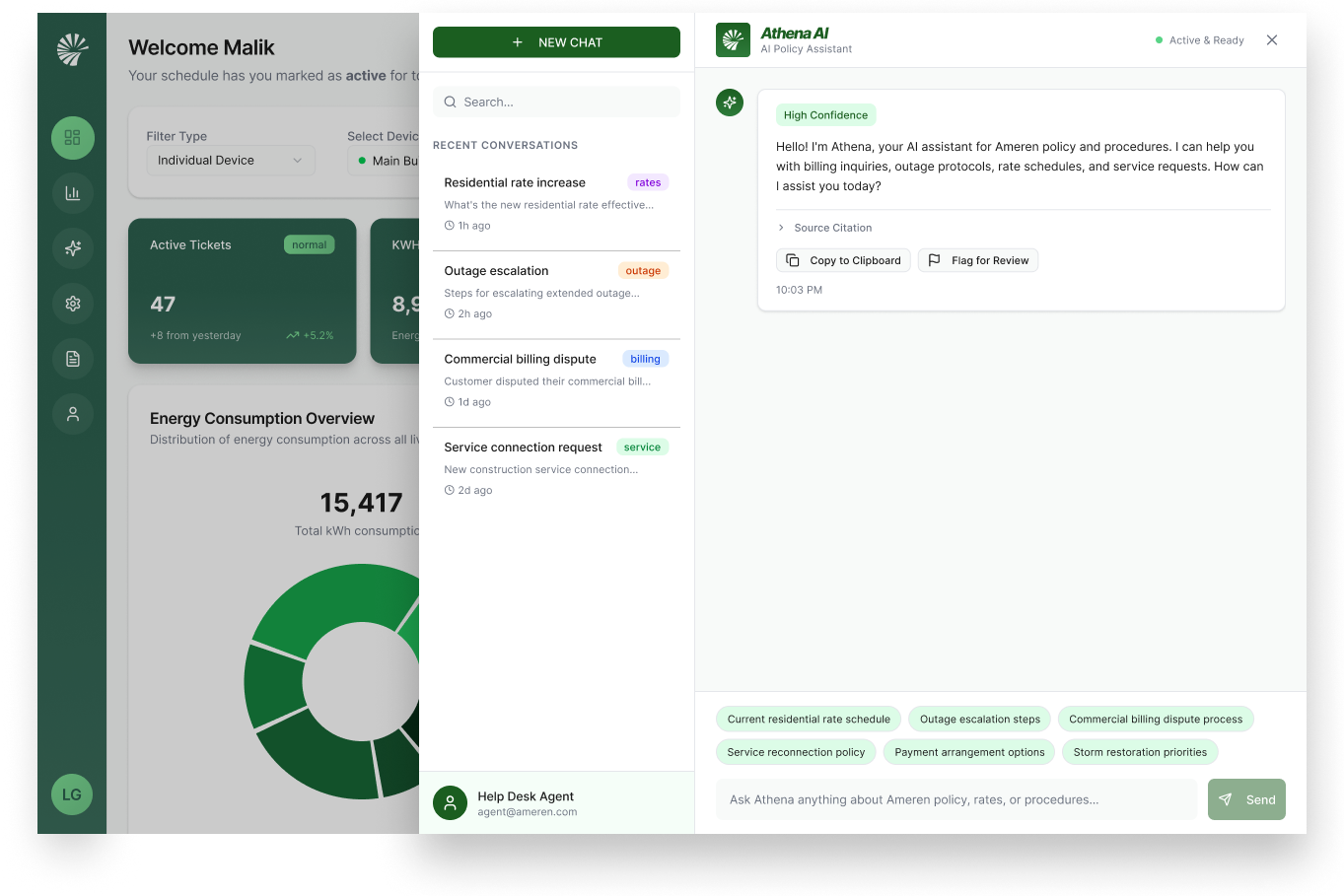 Athena AI, a conversational AI tool, trained on Ameren's full policy documentation and built to be as frictionless as a chat interface.
